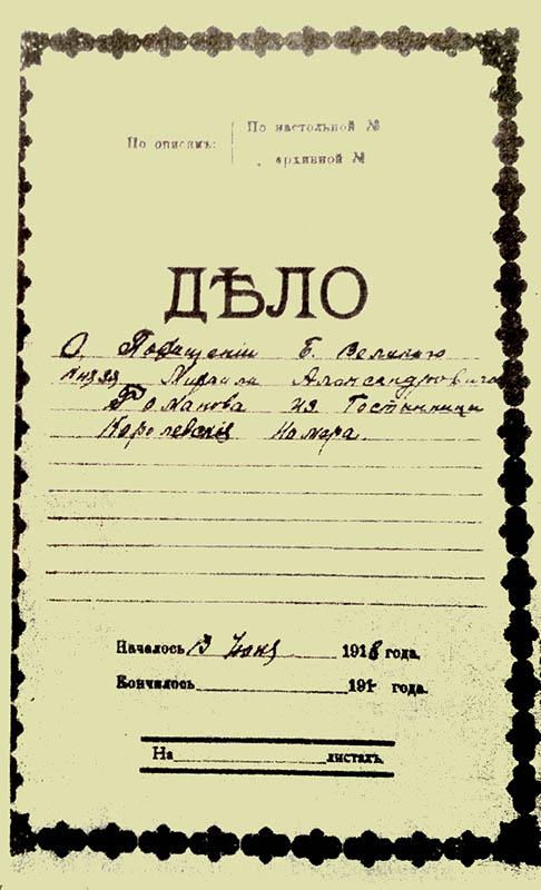 1918 г. июня 13, Чрезвычайный Комитет по борьбе с контрреволюцией, спекуляцией и саботажем, рассмотрев заявление, переданное по телефону из гостиницы Королевские номера в 12ч.15 мин. ночи 12 –го на 13 – е число сего июня, об аресте тремя неизвестными Михаила Романова и имея в виду, что в данном случае усматриваются признаки преступного деяния, предусмотренного постановлением Всероссийской Чрезвычайной комиссии по борьбе с контрреволюцией.