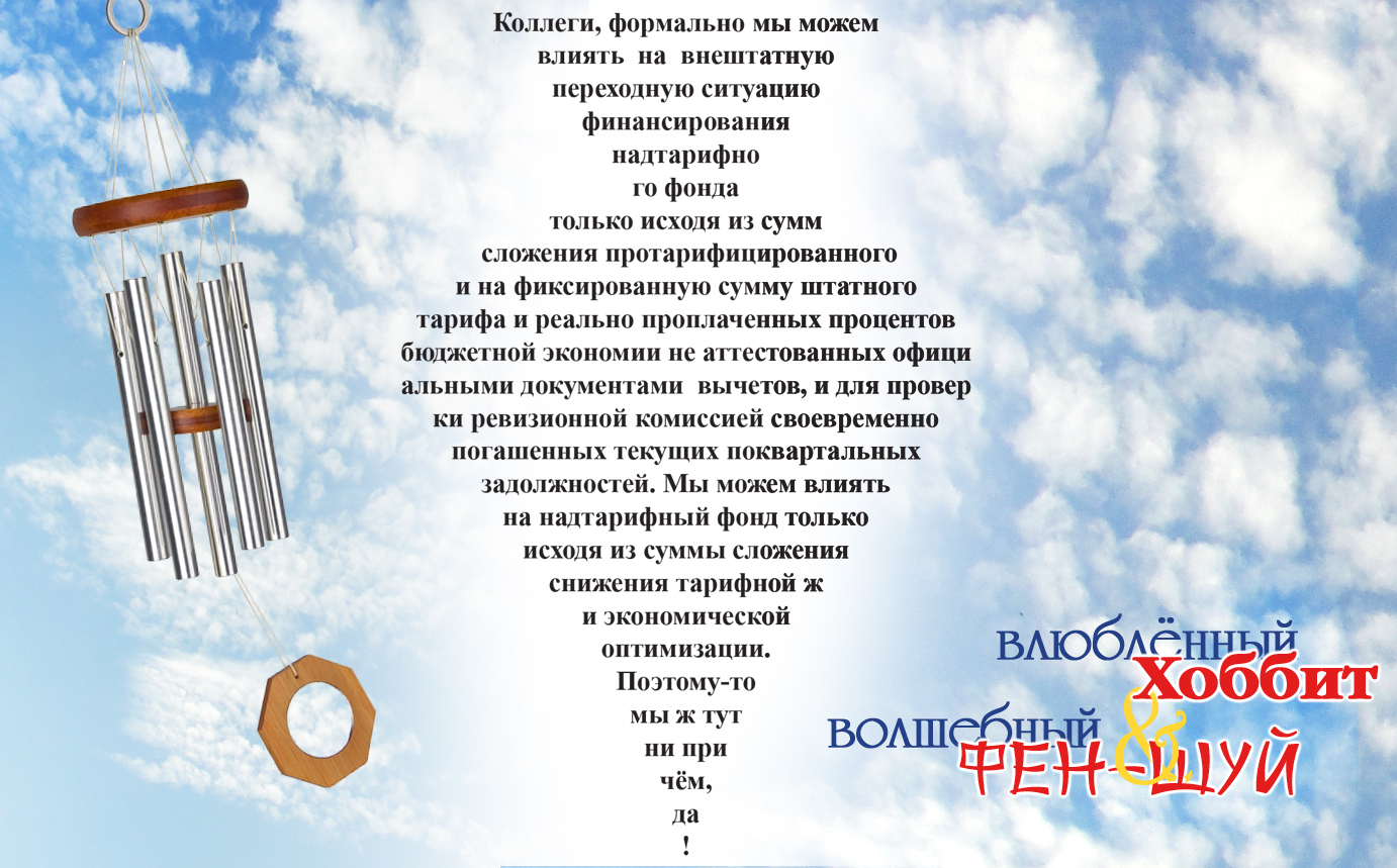 – Это очень хорошо, что у вас всего одна комната – фэн-шуй быстрее заработает! – приговаривал Хоббит, развешивая купленные в переходе талисманы, – чувствуете, Леночка, как воздух начал свободно циркулировать?