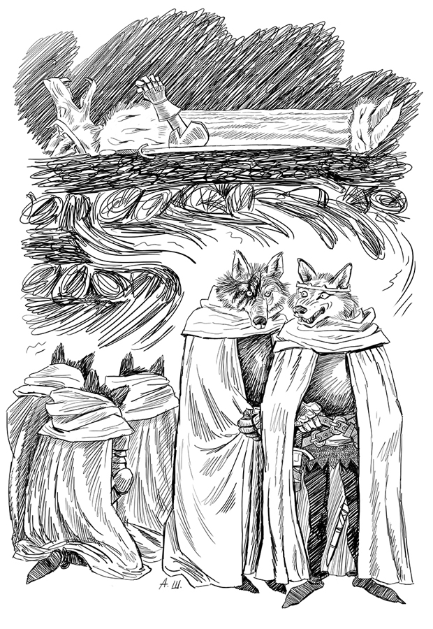Молодой король остановился. Но его остановил не страх, а странное чувство удивления и беспомощности от соприкосновении с неведомой и непонятной силой волшебства, дремавшее с далёкого детства. Чего только не показалось в эти мгновения волколаку. Казалось, из рукава волшебника выползла длинная чёрная змея, и, обвив его посох, страшно уставилась маленькими немигающими глазками на молодого короля. Казалось, что капюшон его собственного плаща вот-вот закроет от него свет, и холодная ткань сдавит горло. Казалось, под его ногами начинает таять снег, и земля расходится, затягивая в глубину, где зимуют страшные подземные существа. Но каркнул за спиной ворон, и видения исчезли, и только странный одинокой путник с усмешкой и сожалением смотрел на молодого короля, чья решимость разом исчезла.