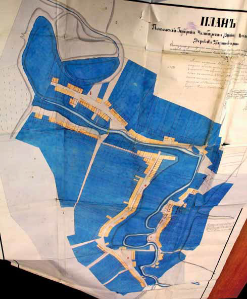 План д. Кутеевщины на 304 двора с указанием мечетей (красные значки), 1878 г. (ГАПО, ф.158, оп.2, д.1752)