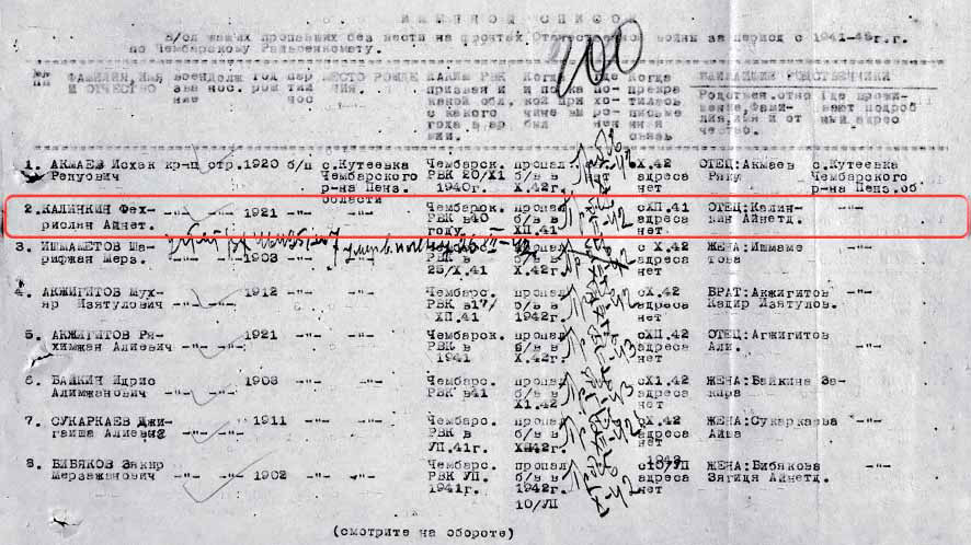 "Мой дедушка, Калимкин Бядрислям Айнетдинович, родился в 1928 г. в с. Кутеевка, в семье колхозника. Детей в семье было пятеро: трое мальчиков и две девочки. К началу войны старший брат Абдулла погиб при несчастном случае. Старшая сестра Сафия была замужем. Имела двоих детей. Дедушке было 13 лет. Жили они трудно. Разруха и нищета – были обычными явлениями. Мужчин нашего села стали забирать на фронт. Прадед Айнетдин не был призван в действующую военную службу по возрасту. Ведь он прошел Первую мировую войну, воевал в годы Гражданской войны. Средний брат, Фахрислям, добровольцем ушел на фронт. Там он был разведчиком. К сожалению, с войны не вернулся. В 1942 г. пропал без вести. Моя прабабушка Каюмя тяжело переживала невосполнимую утрату, потерю сына. С теплотой его вспоминали соседская детвора. До войны он для них мастерил качели, разные игрушки, свистульки…