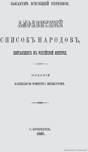 Более века назад, в 1895 г., накануне всеобщей переписи был подготовлен "Алфавитный список народов, обитающих в Российской Империи". В документе были приведены названия народов, проживающих на данной территории, названы их языковая и религиозная группу. При этом указанная численность населения относится к разным периодам времени, но примерно соответствует фактическим значениям. В частности, предисловие к данному изданию рассказывает о том, что "Этот труд доказывает ту незыблемую истину, что при всем многообразии своего населения (более 140 отдельных народов), Россия есть достояние русской народности, постепенно и неуклонно распространяющейся на запад, юг и восток. Это подтверждается и цифрами: русская колонизация азиатских владений и распространение русского землевладения на западные окраины. Единство Империи яснее проявляется в цифрах: в 1886 г. из 113 млн душ населения на долю великороссов, малороссов и белорусов приходится 80 млн, или более 70 %. А если присоединить к ним «обруселых» инородцев, – то и значительно больше.