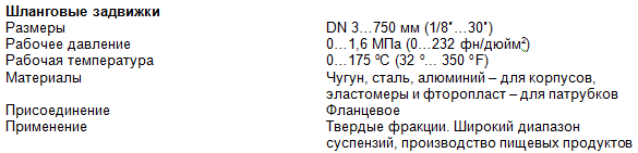 Основные технические характеристики шланговых задвижек