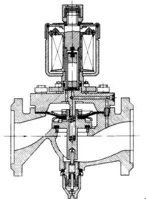 В нём сердечник закрывает или открывает вспомогательное отверстие, соединяющее полость над мембраной с трубопроводом за клапаном. Поскольку площадь мембраны больше площади основного золотника, давление среды через мембрану прижимает золотник к седлу, обеспечивая герметичность.