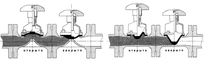2. Полнопроходной тип, в котором используется диафрагма, закрепленная параллельно оси потока и полное закрытие осуществляется опусканием траверсы, прижимающей диафрагму к стенкам корпуса. Полное открытие проходного отверстия обеспечивает минимальное гидравлическое сопротивление.