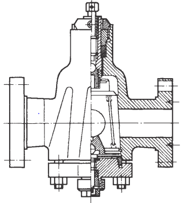 3. Наклонная конструкция с входным и выходным патрубками, расположенными на одной оси, но проходное отверстие выполнено наклонным, что обеспечивает благоприятные условия для движения потока, в результате чего становятся меньше потери давления на клапане (рис. 2.15.).