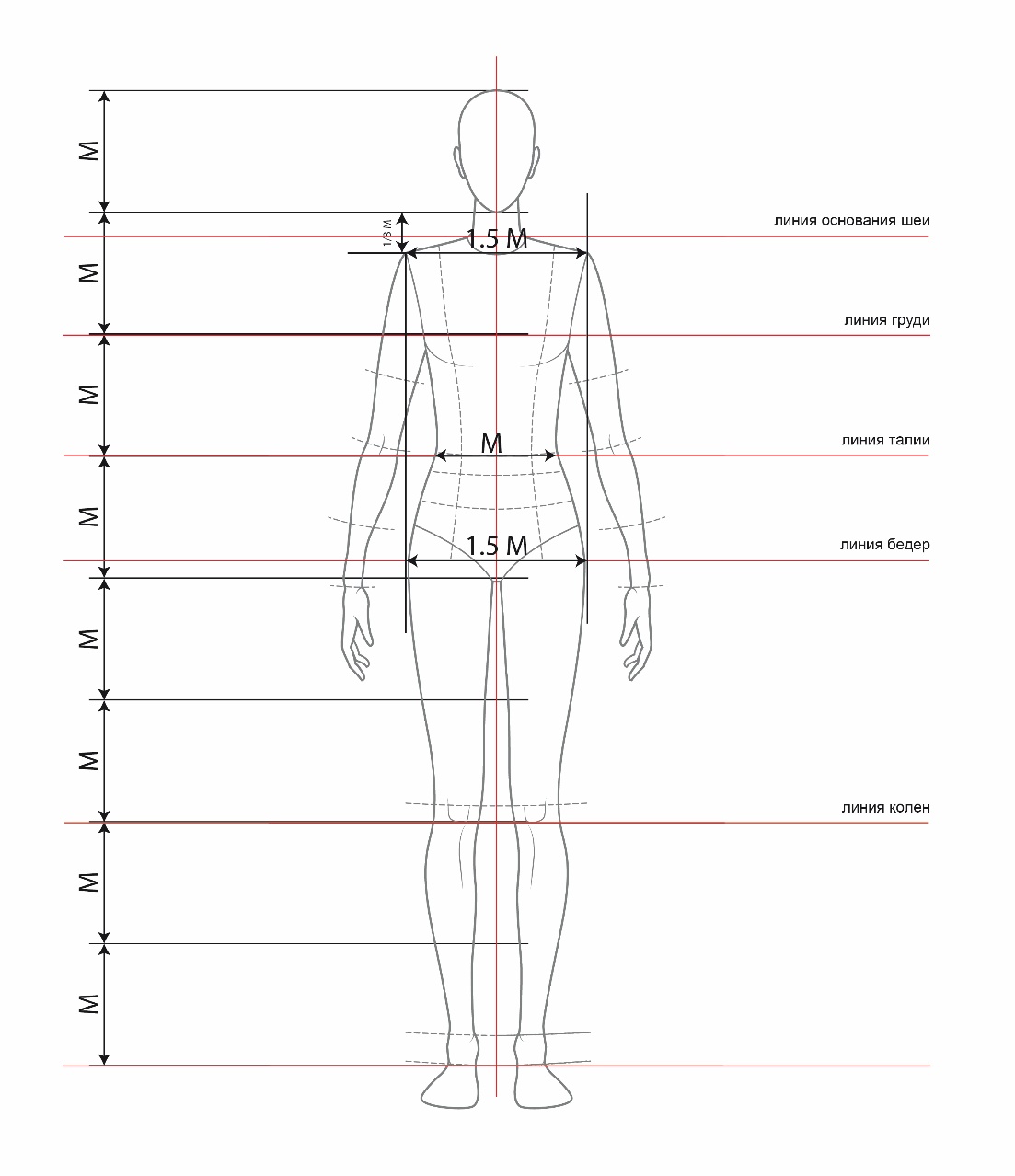 Для создания технического рисунка применяется шаблон фигуры человека, максимально приближенный к естественным пропорциям. Идеал фигуры человека изменялся в разные времена, но всегда существовали каноны человеческих пропорций.