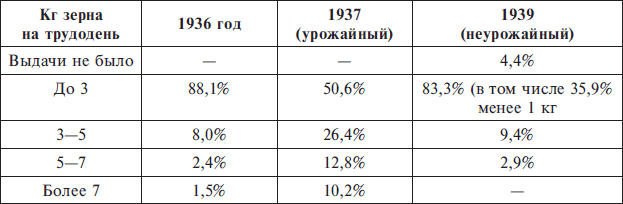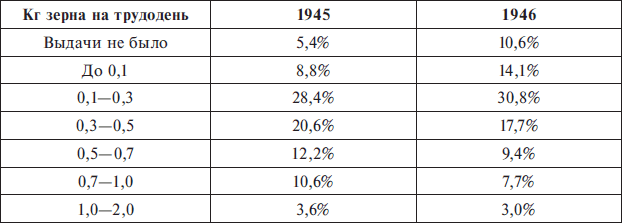 Средняя выдача зерна колхозникам по трудодням составляла: в 1940 году – 1,6 кг, в 1943 – 0,7 кг, в 1944 – 0,8 кг.