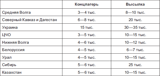 3. Ориентировочно, в соответствии с данными мест, установить по областям следующее распределение заключаемых в лагеря и подлежащих высылке: