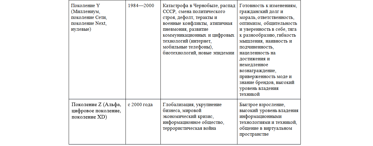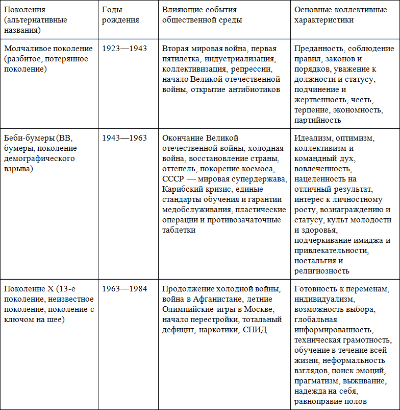 Изначально состоятельность данной концепции поколений была подтверждена авторами на примере американской истории. Но она была адаптирована отечественными исследователями к реалиям развития российского общества. На основе анализа основных событий в нашей стране были выделены и охарактеризованы пять поколений, которые в настоящее время живут на территории Российской Федерации, все они представлены в таблице ниже[39]. Мы видим, что поколения довольно заметно отличаются по своим ценностным ориентирам и деловым установкам (таблица 4).