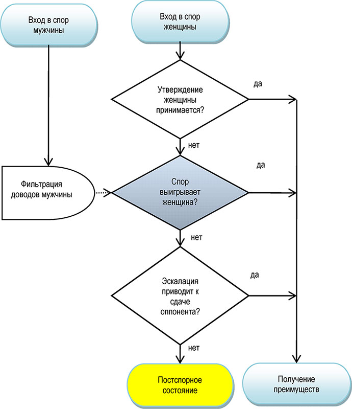 Особо хотелось бы обратить ваше внимание на то, что если спор мужчин заканчивается однозначно, то в споре с женщиной вариантов выхода два: либо женщина получает определённое преимущество над вами; либо переходит в постспорное состояние, которое не является ни вашим выигрышем, ни её проигрышем.
