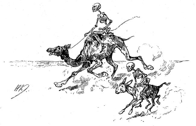 Едет Голод, костяк костяком: очи провалились, зубы оскалены – и едет на тощем-претощем верблюде, кожа да кости… Едет и сестрица его Жажда, телом вся в брата, а сидит, еле держится, на тощем осле-ишаке.