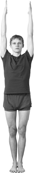 Если вам не удается вытянуть руки в локтях, если у вас болят плечи, если возникает ощущение того, что грудная клетка сжата и вам трудно дышать, не сплетайте пальцы рук. Просто вытяните руки вперед, разверните ладони и внутреннюю часть рук друг к другу и поднимите руки вверх, насколько возможно. Старайтесь не прогибать поясницу и не отклонять голову назад, напрягая затылок и шею.
