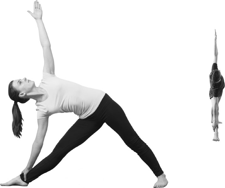 Техника выполненияИз Тадасаны со вдохом прыжком расставьте стопы в стороны на 1,1–1,2 м, вытяните руки. Поверните левую стопу внутрь на 60°, все туловище и всю правую ногу разверните наружу вправо. На выдохе вытяните левую руку вперед и поставьте пальцы левой руки с внешней стороны правой стопы. Верхнюю правую руку разверните ладонью вперед. Со вдохом разверните шею и голову и смотрите на большой палец верхней руки. Держите ноги, туловище, руки, шею и голову в одной плоскости. Останьтесь в позе 20–30 секунд. Дышите спокойно. Со вдохом поднимитесь и выполните позу влево. Поднимитесь на вдохе, поставьте стопы параллельно друг другу. Опустите руки до положения параллельно полу и на выдохе прыжком вернитесь в Тадасану.