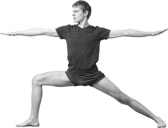 Из Тадасаны на вдохе прыжком расставьте стопы в стороны и вытяните руки. Поверните стопы вправо так же, как при выполнении Уттхита триконасаны. На выдохе согните правую ногу до прямого угла так, чтобы бедро оказалось параллельно полу, а голень – перпендикулярна. Старайтесь держать согнутую ногу в одной плоскости с туловищем и задней ногой. Сделайте несколько дыханий. Держите корпус фронтально. Равномерно вытягивайте руки в стороны от центра грудной клетки. Со вдохом разверните шею и голову вправо и смотрите поверх пальцев правой руки. Не напрягайте затылок и шею. Останьтесь в позе 20–30 секунд. Дышите спокойно. Со вдохом поднимитесь, поставьте стопы параллельно друг другу. Поверните правую стопу внутрь, левую – наружу и выполните позу влево, следуя всем предыдущим указаниям. На вдохе поднимитесь из позы. Поставьте стопы параллельно друг другу и на выдохе прыжком вернитесь в Тадасану.