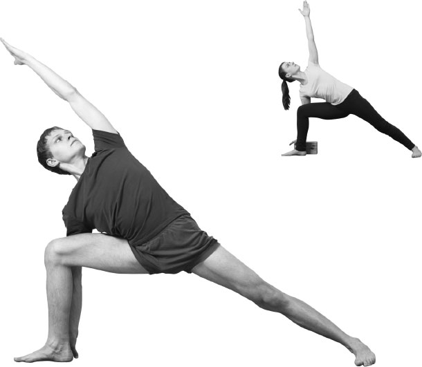 Из Тадасаны на вдохе прыжком расставьте стопы в стороны, вытяните руки. Поверните стопы вправо и с выдохом согните правую ногу до прямого угла, как в Вирабхадрасане 2. Сделайте несколько дыханий. Затем на выдохе вытяните правую руку и правый бок дальше вправо, поставьте кончики пальцев правой руки на пол позади правой стопы. Разверните левую руку в плечевом суставе так, чтобы вся внутренняя поверхность руки смотрела в сторону головы. На выдохе вытяните левую руку над головой. Со вдохом разверните шею и голову и посмотрите на верхнюю часть левой руки. Не напрягайте затылок и шею. Останьтесь в позе 20–30 секунд. Дышите спокойно. На вдохе поднимитесь, поставьте стопы параллельно друг другу. Поверните правую стопу внутрь, левую ногу наружу и выполните позу влево, следуя всем предыдущим указаниям. На вдохе поднимитесь из позы. Поставьте стопы параллельно друг другу и на выдохе прыжком вернитесь в Тадасану.