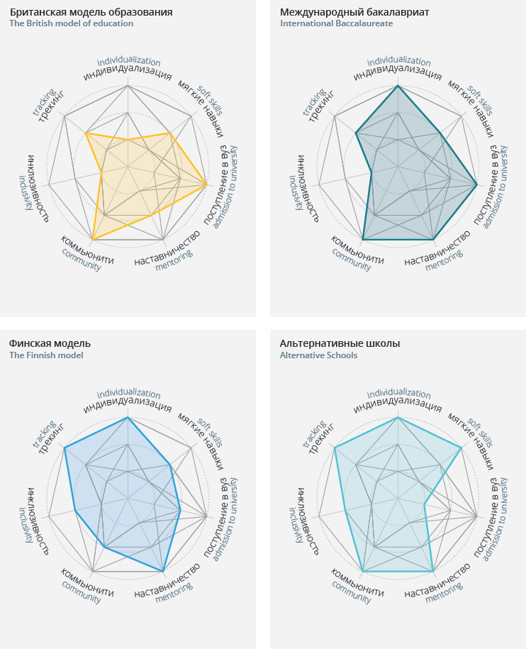 Finally, we can see similarities in the following model pairs: the Russian and Asian models, which focus heavily on academic success; the Finnish model and the model of alternative schools focusing on "soft skills"; the British model and the International Baccalaureate as an attempt to frame soft-skills education academically.