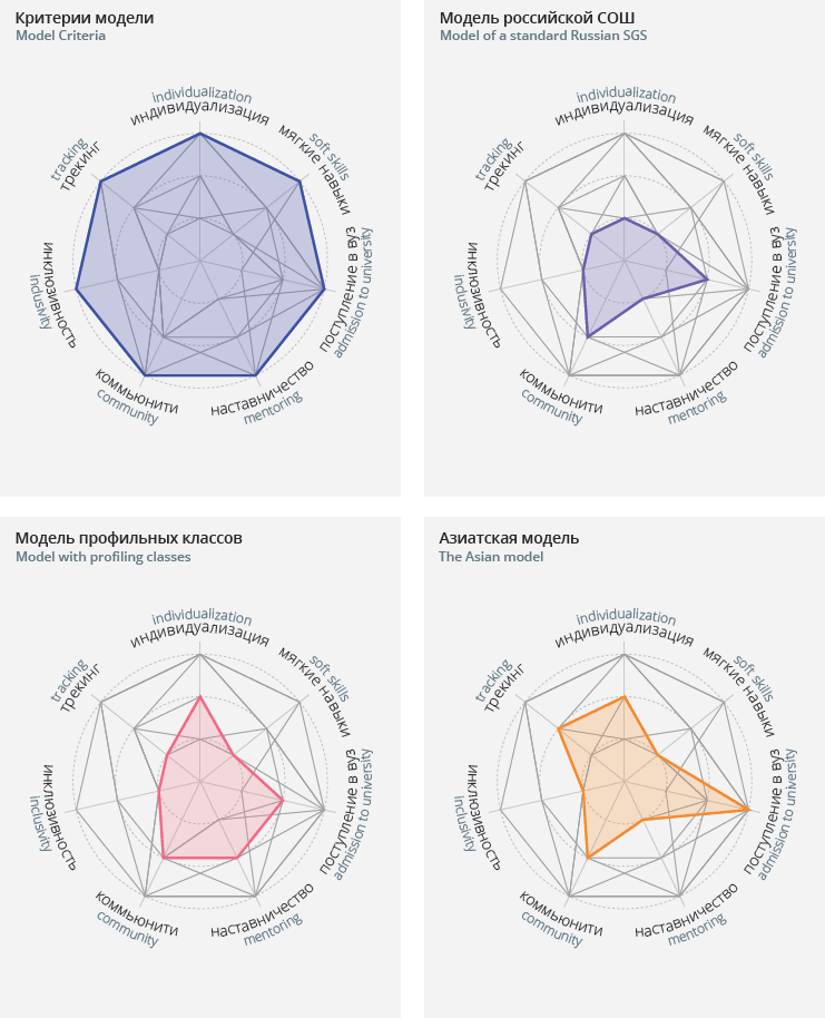 After reviewing the literature, conducting expert interviews, and analyzing the cases of different schools, each school education model identified was assigned a score from 1 to 3 for each of the 7 criteria named above. Below are spider diagrams visualizing the full list of models and assigned scores by each criteria.
