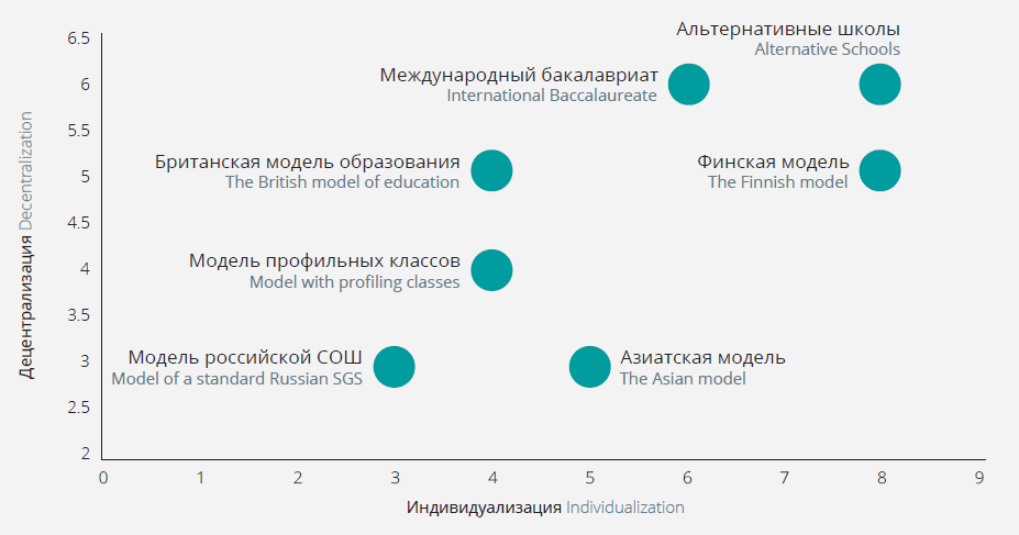 The chart shows how the models relate to each other in terms of a certain set of criteria. Thus, we can see that the Russian state SGS model differs from the Asian model primarily in the degree of personalization, with the same centralization level. The chart also shows that the aforementioned model pair of alternative and Finnish schools also differs in only one plane: that is, the degree of decentralization. Remarkably, the International Baccalaureate, being a modification of the British model of education, makes a step towards alternative schools and the Finnish model in terms of decentralization and personalization.